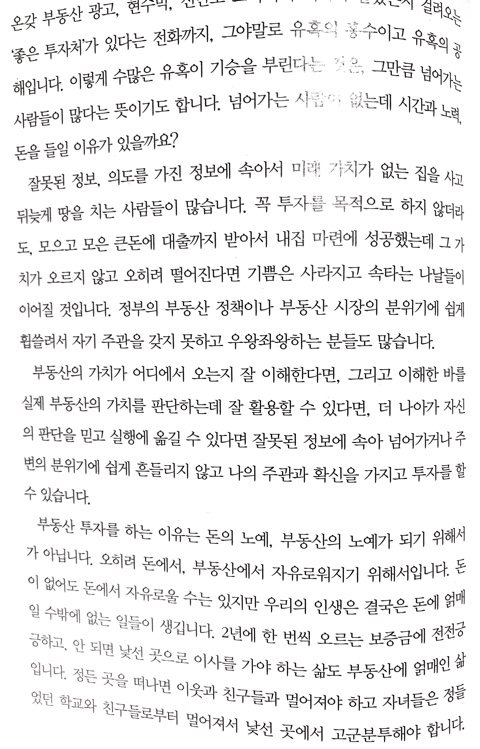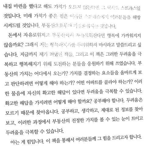'잘못된 정보, 의도를 가진 정보에 속아서 미래 가치가 없는 집을 사고 뒤늦게 땅을 치는 사람들이 많습니다. (중략) 부동산 투자를 하는 이유는 돈의 노예, 부동산의 노예가 되기 위해서가 아닙니다. 오히려 돈에서, 부동산에서 자유로워지기 위해서인빈다. 돈이 없어도 돈에서 자유로울 수는 있지만 우리의 인생은 결국은 돈에 얽매일 수밖에 없는 일들이 생깁니다.'