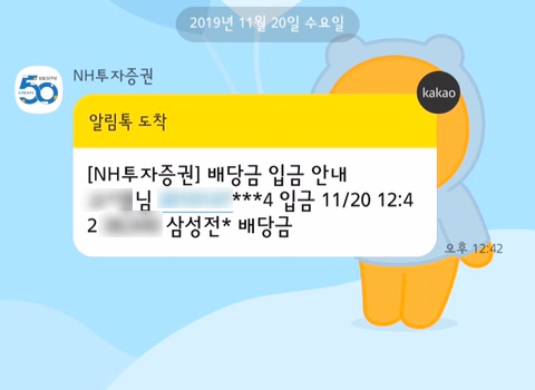 주식은 공부 차원에서 아주 조금 하고 있는데 #삼성전자 3분기 배당금이 들어왔다는 카톡이 왔더군요. 삼전은 일년에 4번 분기별 배당하는 주식인데 최근 흐름도 매우 좋고, 소액이지만 이렇게 배당금이 들어와 보유하고 있는 보람이 있습니다.
