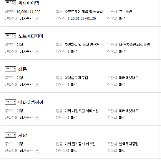 네이버 증권 IPO 찾아보고 깜짝 놀랐습니다. 연초에 공모주가 적은 비수기라고는 하지만, 정말 적더군요. 1월 29-30일에 교보증권을 주관사로 상장하는 위세아이텍이 유일합니다.