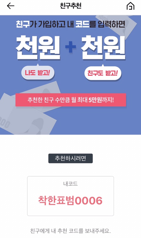 카뱅과 비슷하게 가입 후 추천인 코드를 입력하면 가입자와 추천인 모두에게 천원 캐시백이라는 혜택이 있습니다. (카뱅 대비 소소하긴 하네요. ㅜ.ㅜ) 가입 후 어플 내에서 홈 - 전체메뉴 - 친구 추천 순으로 들어가 친구 코드를 입력하면 되는데요.