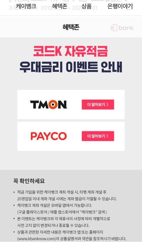 저는 케이뱅크 가입 시 이벤트로 받은 코드 하나에 티몬으로 받은 코드 하나로 총 2개 계좌를 개설했어요. ^^ 페이코까지 받아서 3개 만들고 싶긴 한데 음...;;