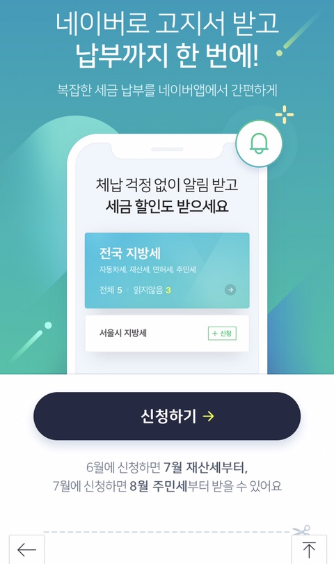네이버로 고지서 받아보기를 신청하면 전국 지방세, 즉 자동차세, 재산세, 주민세, 면허세 고지서를 네이버에서 볼 수 있고, 네이버페이로 바로 납부할 수 있다는 내용입니다.